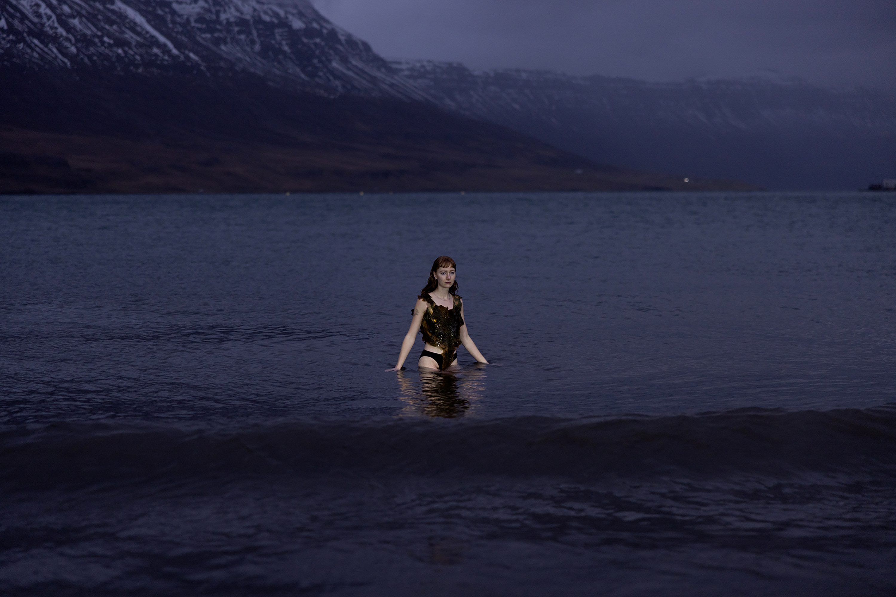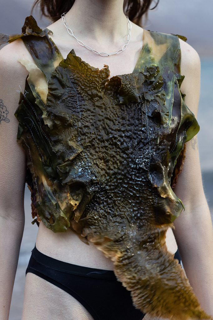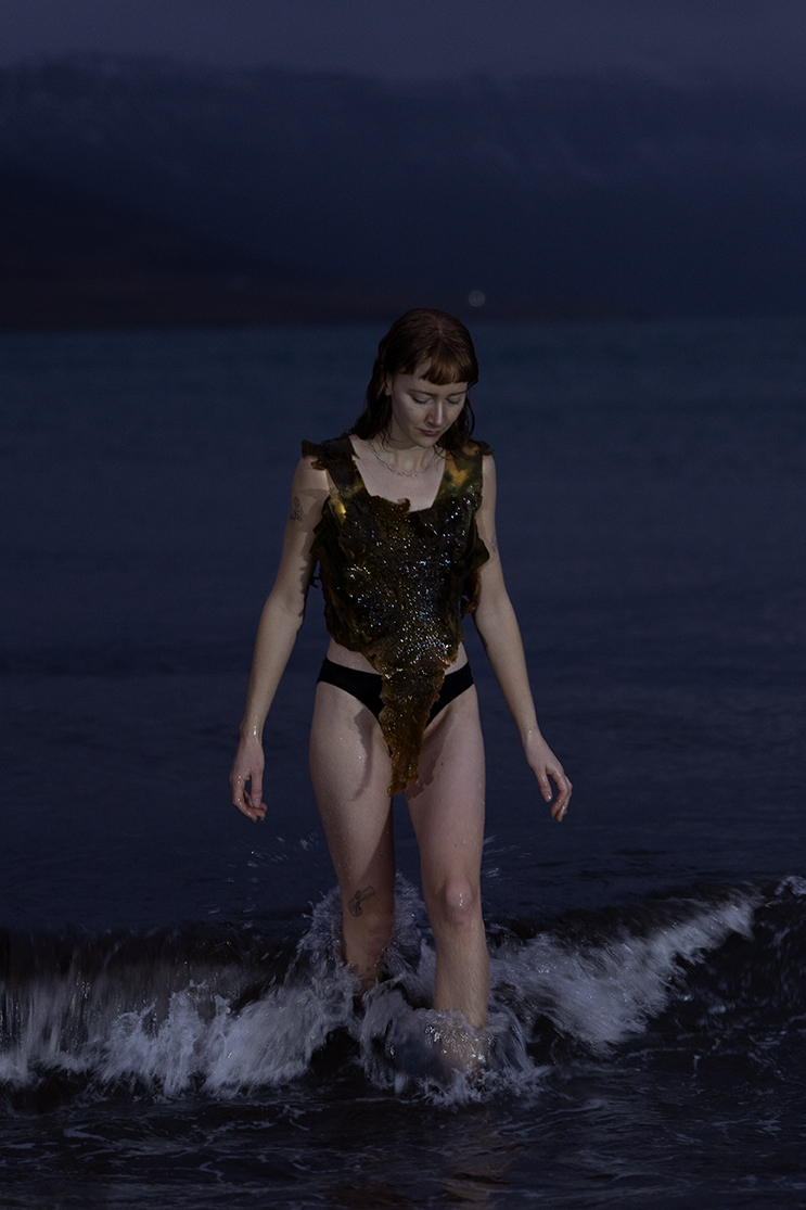 Second Skin/Fjord Skin 2023 A protective vest made from sewn together seaweed, sourced from Seyðisfjörður fjord. Exhibited as part of Big Cod at Herðubreið, Seyðisfjörður. Photographs by Shan Turner-Carroll